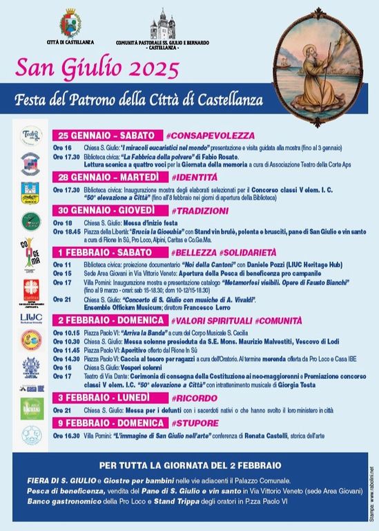 Con la fine del mese di gennaio, torna puntuale l’appuntamento con la Festa di San Giulio, il Santo Patrono della città di Castellanza che, come ogni anno, animerà la comunità con una serie di iniziative ed eventi che dureranno per tutta la prossima settimana.