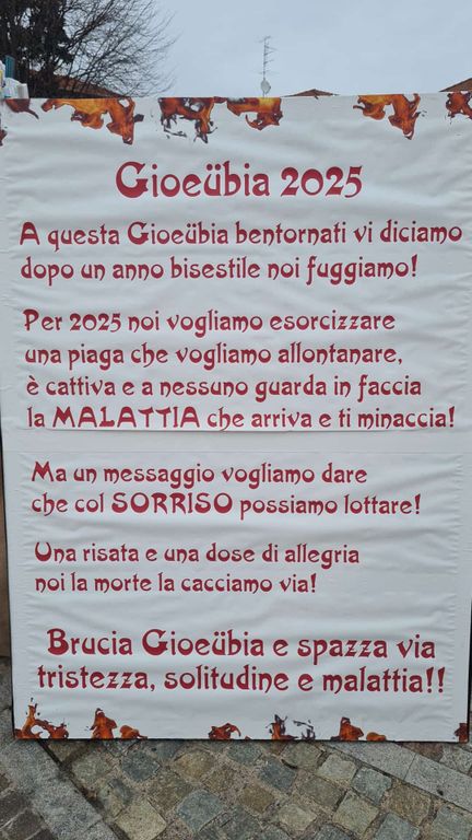 Il messaggio del sindaco Pietro Zappamiglio: «Cari amici e amiche, tutto è pronto e scatta il conto alla rovescia per l’accensione stasera della Gioeubia, preceduta dall’assaggio di polenta e bruscitt, dolci e vin brulè. Il fantoccio creato dall’associazione Pro Giovani è spettacolare e benaugurante: alto quasi quattro metri, si staglia nella nostra piazza, e raffigura una donna in camice da paziente che scaccia la malattia con un gesto scaramantico. La Gioeubia quest’anno vuole esorcizzare la malattia col rito del fuoco. Vi invito ad osservare la scatola gigante di “Lemeichetasi”, un “farmaco” da assumere prima di parlare. Che dire: abbiamo fatto le cose in grande. Sono orgoglioso delle nostre tradizioni. Facciamo comunità. Vi aspetto stasera. Buona Gioeubia».