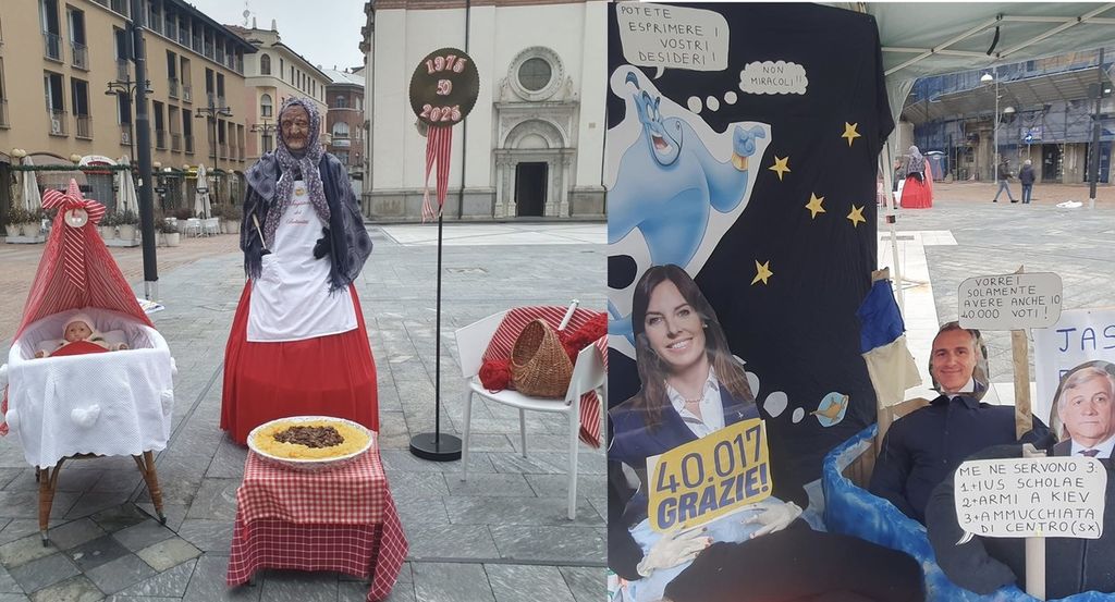 Emanuele Antonelli guida la "delegazione" politica bustocca che si è recata in piazza Santa Maria ad ammirare la creatività delle Giöbie 2025