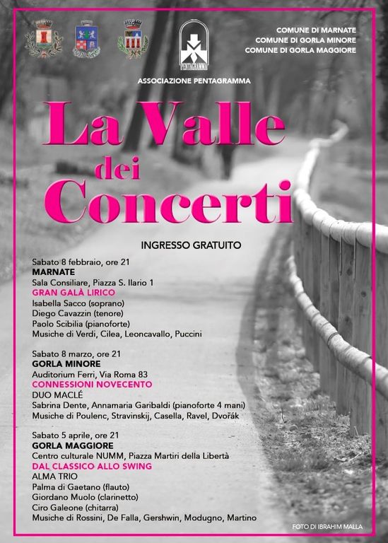 Ad aprire “La Valle dei concerti”, dunque, organizzata anche grazie alla collaborazione con l’associazione Pentagramma, si aprirà con il Gran Galà lirico che si svolgerà sabato 8 febbraio alle 21 all’interno della sala consiliare di Marnate, per poi proseguire, sabato 8 marzo, sempre alle 21, con il Duo Maclè che darà vita alle “Connessioni Novecento” all’Auditorium Peppo Ferri di Gorla Minore; a concludere la rassegna, sabato 5 aprile alle 21 al NUMM di Gorla Maggiore, sarà l’Alma Trio con “Dal classico allo Swing”.