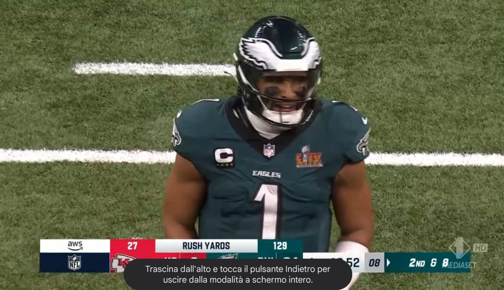 Nonostante ci si attendesse un match più che equilibrato, con i bookmaker che davano Mahomes e compagni favoriti con appena un punto di vantaggio, sono state le “Aquile” ad avere la meglio ipotecando la partita già nella prima metà della gara, con un 24-0 frutto di due td del qb Jalen Hurts (uno su corsa e un lancio per AJ Brown) e un pick-six di Cooper DeJean, e poi mettendola in ghiaccio con un altro td pass di Hurts (poi eletto mvp), questa volta per DeVonta Smith (34-0). Il moto d'orgoglio di Chiefs frutta solo uno scarto meno amaro: l'edizione numero 59 del Super Bowl si chiude 40-22.