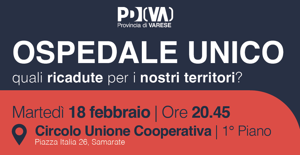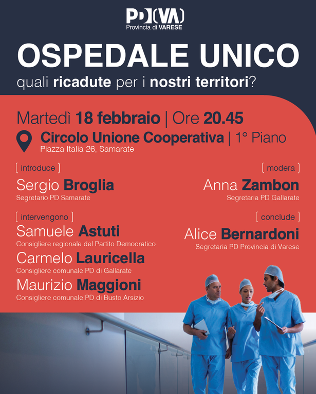 Martedì 18 febbraio, alle 20.45, il primo incontro dedicato al futuro degli ospedali e alle implicazioni dell'ospedale unico. Interverranno Samuele Astuti, Sergio Broglia, i consiglieri comunali Carmelo Lauricella e Maurizio Maggioni e le segretarie Anna Zambon e Alice Bernardoni