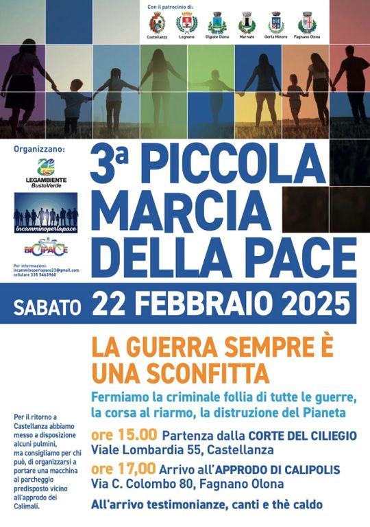 Sabato 22 febbraio avrà luogo la terza edizione della Piccola marcia della Pace, organizzata da Legambiente Busto Verde, Bicipace e dal tavolo InCamminoperlaPace, che coordina oltre 30 realtà del territorio.