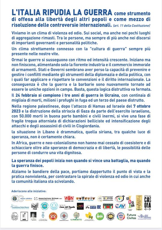 «È necessario - continua Castiglioni -, che le nostre comunità si scuotano: ci raccontano che la guerra è uno strumento inevitabile e che l’unico modo per non soccombere è il riarmo. Con la Piccola Marcia vogliamo denunciare la falsità di questo approccio alla politica internazionale e il grande pericolo che esso comporta. Durante la marcia, incontreremo cittadini e cittadine per raccontare anche le iniziative di promozione della cultura della pace che le nostre organizzazioni stanno portando avanti».