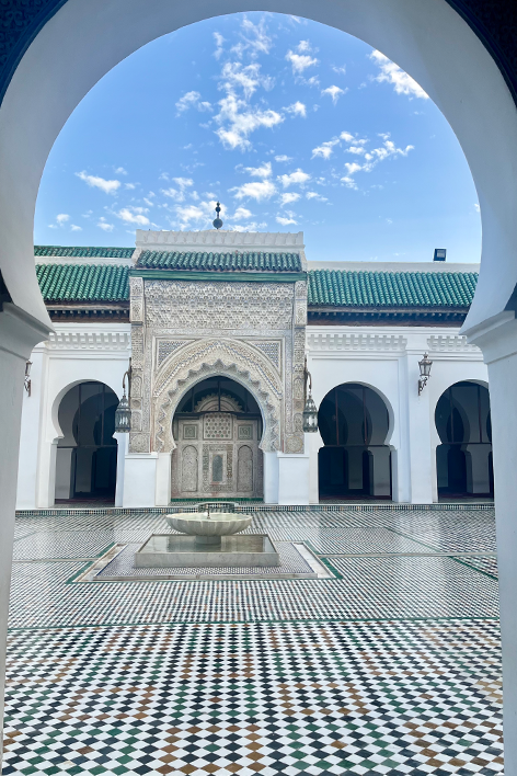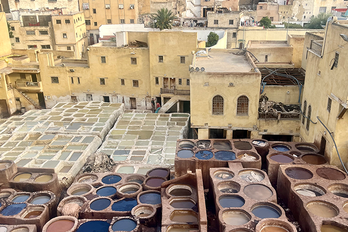 Dopo aver sorseggiato il famosissimo tè alla menta nella piazza centrale, siamo saliti sul nostro pulmino pronti per la prossima tappa del viaggio. Arrivati a Fes, ci ha accolto Louki, una guida locale incredibilmente spiritosa che ha arricchito la nostra visita con una buona dose d’ironia. Ci siamo addentrati nella Medina El-Bali, un labirinto di vicoli dove ogni angolo raccontava una storia. Abbiamo visitato la Madrasa Bou Inania, la Moschea Al-Qarawiyyin e, naturalmente, le celebri concerie di Chouara. Dall’alto delle terrazze, abbiamo ammirato gli uomini immersi nelle vasche di tintura, riempite di colori vivaci: rosso papavero, giallo zafferano, blu indaco. L’odore era forte, ma con un rametto di menta sotto il naso siamo riusciti a seguire l’opera degli artigiani; alcuni trattavano le pelli con sostanze naturali come calce ed escrementi di piccione per ammorbidirle. Un mestiere molto faticoso dalle origini antiche!