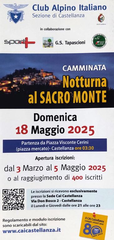 Nella seconda metà del mese di maggio, poi, ornerà uno degli appuntamenti più antichi e amati della città di Castellanza, quello con la “camminata notturna Castellanza – Sacro Monte”, che quest’anno, come il CAI, compie ben 80 anni. «Si tratta di una camminata – spiegano il presidente Sandro Corsi e gli altri membri del direttivo – nata nel 1945 quando un castellanzese, scampato alle deportazioni, durante la guerra promise che se fosse sopravvissuto avrebbe raggiunto a piedi il Sacro Monte di Varese ogni anno della sua vita. Nel corso degli anni in molti si unirono a lui nel percorso, fino a quando il club del Tapascioni non iniziò ad organizzare ufficialmente questo evento per passare il testimone, una decina di anni fa, a noi del CAI». L’appuntamento, dunque, è per le 3.30 domenica 18 maggio in piazza mercato, da dove il gruppo partirà per raggiungere, rigorosamente a piedi, il santuario che sovrasta Varese; sarà possibile iscriversi a partire dal 3 maggio presso la sede dell’associazione castellanzese, sino al 5 maggio o al completamento dei 400 posti disponibili.