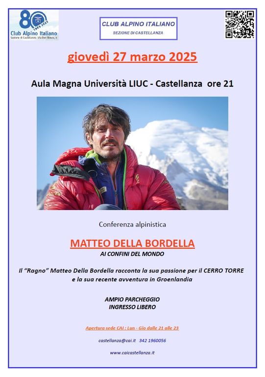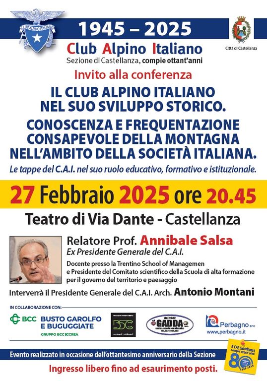 Il primo sarà giovedì 27 febbraio alle 20.45 al Teatro di Via Dante, dove l’ex Presidente Generale del C.A.I. Annibale Salsa parlerà ai presenti de “Il Club Alpino Italiano nel suo sviluppo storico. Conoscenza e frequentazione consapevole della montagna nell’ambito della società italiana”. Un momento di pregio dedicato alla storia del Club Alpino Italiano che vedrà salire sul palco anche l’attuale Presidente Generale Antonio Montani, è che è dedicato non solo ai membri della sezione di Castellanza, ma agli appassionati della montagna di tutto il territorio. Giovedì 27 marzo, invece, l'aula magna dell’università Liuc ospiterà alle 21 l’ex alunno e ex ricercatore Matteo Della Bordella, oggi alpinista di fama internazionale, che racconterà durante la serata “Ai confini del mondo” la sua passione per il Cerro Torre e la sua recente avventura in Groenlandia.