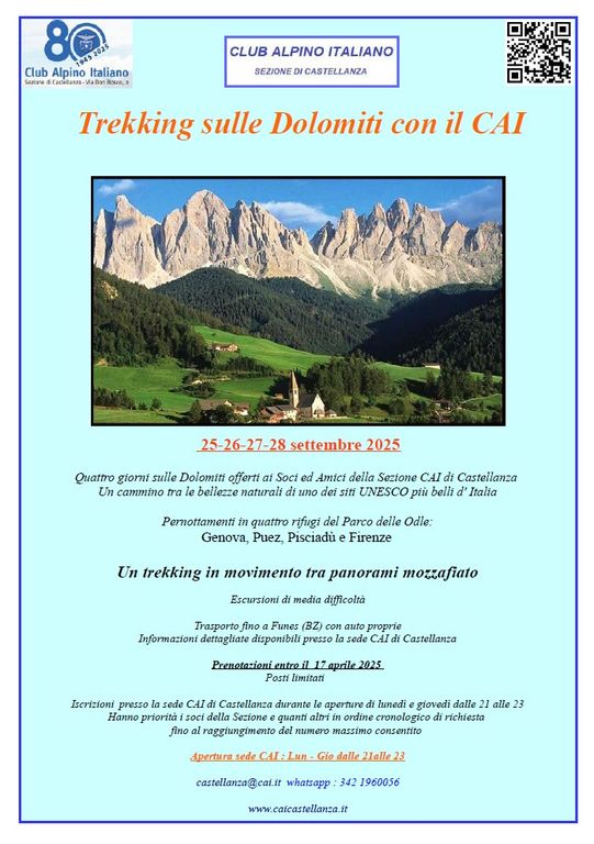 L’ultimo appuntamento sarà quello con il “Trekking sulle Dolomiti con il CAI”, che dal 25 al 28 settembre vedrà i soci della sezione spostarsi lungo i sentieri della suggestiva catena montuosa per raggiungere i rifugi Genova, Puez, Pisciadù e Firenze.