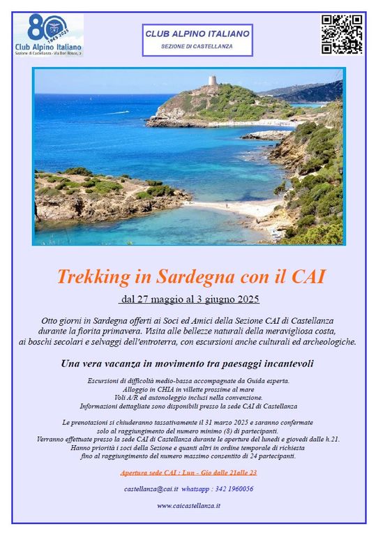 Dal 27 maggio al 3 giugno, invece, è stata organizzata una trasferta Chia per il “Trekking in Sardegna con il CAI” che, grazie a una guida esperta permetterà ai soci di percorrere i sentieri di una delle isole più belle del nostro paese ammirandone le meraviglie naturali e archeologiche. Il fine settimana del 14 e 15 giugno, invece, la Grande Piazza Lineare sull’Olona si trasformerà, in collaborazione con altre associazioni, nel “CAI base camp 80°”, che ospiterà una palestra di arrampicata all’aperto, attività ludico – culturali, letture e racconti animati.