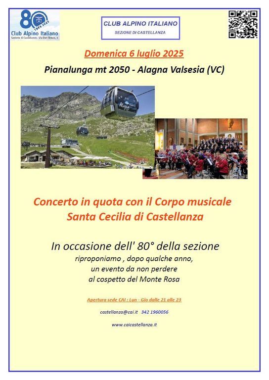 Domenica 6 luglio i festeggiamenti per gli 80 anni della sezione si trasferiranno a Pianalunga, sopra Alagna Valsesia, dove il Corpo Musicale Santa Cecilia di Castellanza tornerà ad esibirsi a 2050 metri in un vero e proprio “Concerto in quota”, per regalare a tutti emozioni certamente indimenticabili.