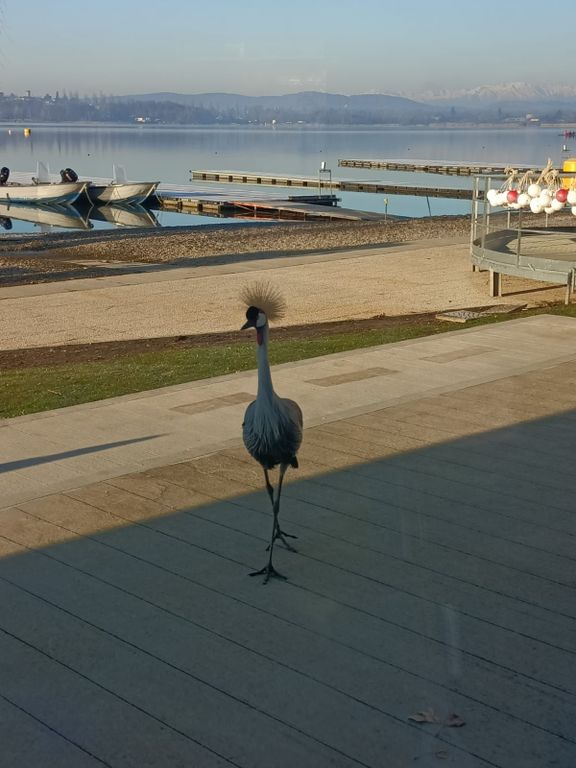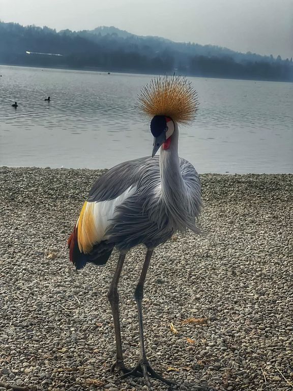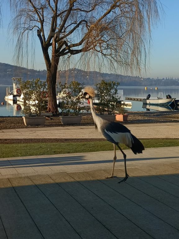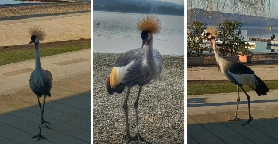 Tra ghiaia, assi di legno, acqua ed erba, forse per rimirare i canottieri in azione dall'alto o, semplicemente, sentendo il richiamo della foresta, visto che le gru stanno migrando proprio in questo periodo, questo spettacolare esemplare ha attirato i selfie e gli sguardi ammirati di tutti ed è stato giustamente protagonista assoluto del pomeriggio in riva al lago. In gita, o in fuga, per almeno qualche ora verso la sua lontana terra d'origine africana, laggiù oltre i colori di acqua, colline e cielo.