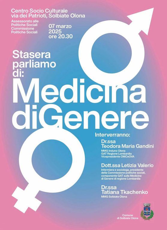 Venerdì 7 marzo, alle 20.30, al Centro Socio Culturale di via dei Patrioti si parla di Medicina di Genere. La serata è organizzata dal Comune di Solbiate Olona – Assessorato e Commissione Politiche sociali (locandina in fondo). Intervengono Teodora Maria Gandini (medico di medicina generale a Induno Olona, componente del Gruppo di Approfondimento Tecnico regionale sulla Medicina di genere, oltre che vicepresidente Omceo Varese), Letizia Valerio (infermiera e sociologa, componente Gat) e Tatiana Tkachenko (medico di medicina generale a Solbiate).