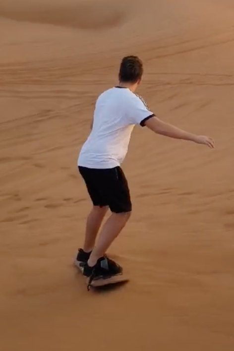 Ho provato il sandboarding nel deserto. Pensavo fosse facile, visto che scio bene, ma la sabbia è tutta un’altra cosa! Ho riso tantissimo, è stata un’esperienza divertente e unica nel suo genere.