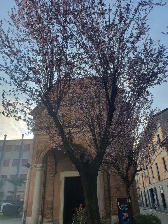 Altri scorci si fanno strada piano piano. Già nelle ore della sfilata del Carnevale si poteva vedere via Pepe colorarsi di rosa, come tra Comune e tempio civico i germogli ora hanno lasciato il posto ai petali. Il cielo ripetutamente grigio tiene un po' a bada i colori, ma basta un momento di tregua e lo spettacolo riprende: anche timidamente, come i fiori - allontanandosi un poco dal centro, - che si stagliano contro l'azzurro e il campanile di Sant'Edoardo.