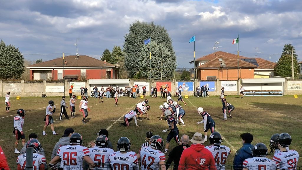 Poi la gara, con la superiorità dei milanesi che è emersa, in maniera chiara, in un primo tempo quasi solo a una direzione, anche grazie alla straordinaria prestazione del quarterback avversario Di Girolamo (7 touchdown). I Deamons sono andati in meta al primo snap offensivo, con un passaggio da oltre 30 yard per Elmi, Busto ha saputo rispondere (Colombo per Dotti) subito dopo ma poi, senza la possibilità di correre, è diventata troppo prevedibile in attacco (5 intercetti nel primo tempo) e, con poca copertura sul profondo, bersaglio facile per il braccio di un chirurgico Di Girolamo. Il 7-42 alla pausa lunga ha messo nero su bianco la differenza tra le due squadra, anche e soprattutto quantitativo, visto l'esiguo numero di giocatori a disposizione dello staff tecnico bustocco (che però da questa settimana potrà contare sulla riattivazione di Matteo Buran, attuale ds dei Frogs Legnano). Secondo tempo di accademia, con la squadra di De Tomasi che almeno si toglie la soddisfazione di mettere a tabellone altri 7 punti con una qb sneak di Colombo.