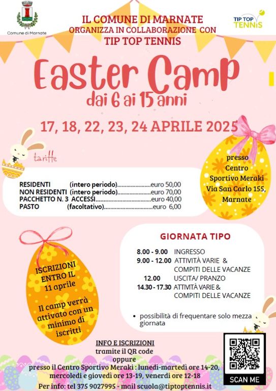 L’Easter Camp si terrà al raggiungimento del numero minimo di iscritti, all’interno del Centro Meraki, nelle giornate del 17, 18, 22, 23 e 24 aprile. Le iscrizioni sono aperte presso il Centro Meraki o tramite il codice QR sulla locandina allegata, fino a domenica 11 aprile.