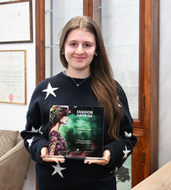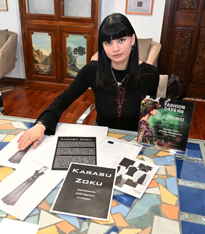 Due ragazze di quarta sono salite sul podio. Delia Mladinescu ha conquistato il secondo posto con una blusa destrutturata ispirata alla tradizione stilistica giapponese, presentata nel progetto “Karasu Zoku”. «Il mio intento – racconta – era dimostrare che anche utilizzando il solo colore nero si potesse comunque ottenere una propria identità. Un messaggio che riguarda l’estetica e parla anche di noi giovani, che solo a un occhio distratto possiamo sembrare tutti uguali e invece abbiamo ciascuno un nostro modo d’essere».