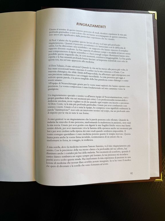"Giunta al termine di questo intenso percorso di studi, desidero esprimere la mia più profonda gratitudine a tutti coloro che mi hanno accompagnato in questo cammino, reso ancor più significativo dalla particolare esperienza che ho vissuto".