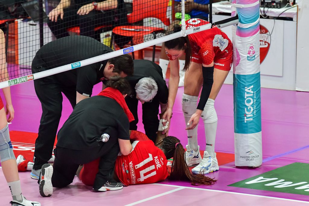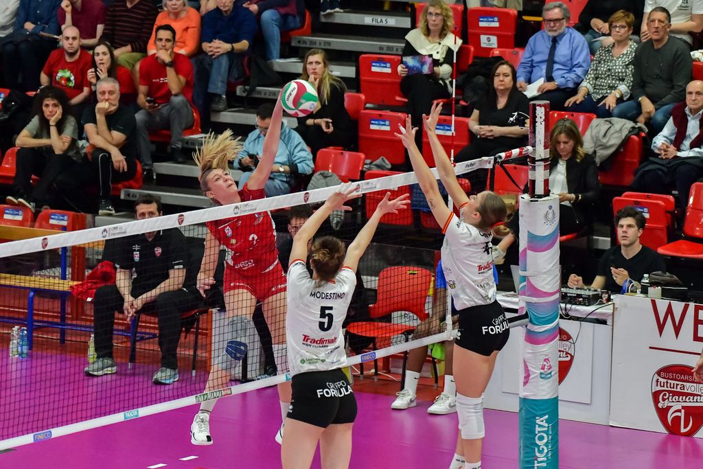 Una Futura contratta e confusionaria nel momento cruciale della partita perde 1-3 gara-1 della semifinale playoff di Serie A2 contro Messina. La squadra bustocca era partita bene, giocando al suo ritmo nel primo set e mantenendo il controllo del gioco. Poi, sul 18-14, una brutta tegola: l'infortunio al ginocchio sinistro di Fatim Kone. Una torsione innaturale (sembra un infortunio serio, di certo non sarà più protagonista in questa serie) dopo una ricaduta da muro. Un colpo durissimo che, unito alla sconfitta ai vantaggi nel primo set (24-26), spegne l'entusiasmo e la carica delle cocche. La squadra fatica a riprendersi, perde nettamente il secondo set (18-25) e si trova psicologicamente sotto nel terzo (13-16).
