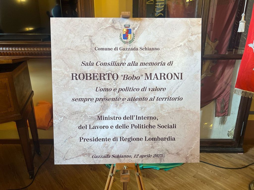 Si è svolta nella mattinata di oggi, sabato 12 aprile, a Villa De Strens, la cerimonia ufficiale di intitolazione della Sala Consiliare del Comune di Gazzada Schianno alla memoria di Roberto Maroni. Un momento denso di emozione e partecipazione, che ha richiamato un folto pubblico e numerose autorità istituzionali, a testimonianza dell’impronta profonda lasciata da Maroni nella vita politica e civile del Paese.