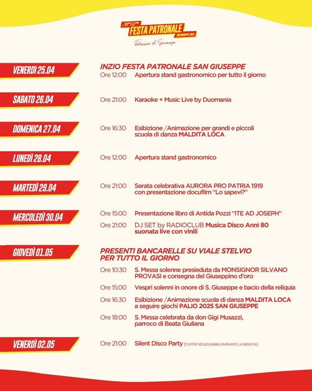 Il primo maggio resta il cuore della festa con l amessa solenne delle 10.30 che verrà presieduta dall'ex parroco monsignor Silvano Provasi. In quell'occasione dal parroco don Giuseppe Tedesco verrà assegnato il Giuseppino d'oro. Un altro modo di rendere grazie a chi silenziosamente si adopera per la comunità.