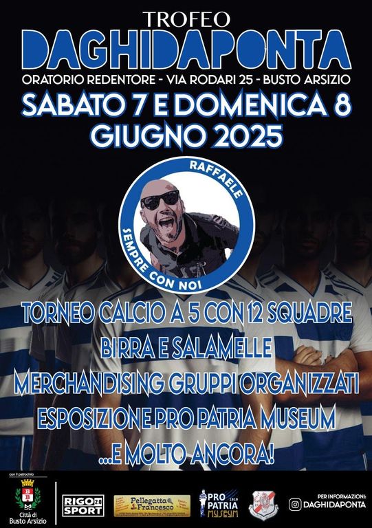 Riecco dunque il torneo in omaggio a Carlo Solbiati, il tifosissimo della Pro Patria che usava questo nickname - Daghidaponta, appunto - nel forum del Bustocco.it, una di quelle iniziative che uniscono in cui la vittoria è già lo stesso condividere un terreno di gioco e tempo. Arriverà il 7 e l'8 giugno la nuova edizione del trofeo, che ha ottenuto anche il patrocinio del Comune di Busto Arsizio. La cornice sarà il campo dell'oratorio del Redentore in via Rodari, la formula sempre quella del calcio a cinque con dodici squadre. Cibo, compagnia, esposizione del Pro Patria Museum, merchandising dei gruppi organizzati. Presto altri dettagli.