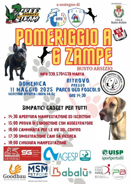 «Un'occasione speciale per vivere un pomeriggio all'aria aperta insieme ai nostri amici a quattro zampe, tra attività, dimostrazioni e solidarietà». Chiama i bustocchi Alessandro Albani, assessore e grande amante degli animali, da sempre a fianco nell'organizzazione della "Passeggiata a sei zampe", promossa da Free Runners Team con il patrocinio del Comune e l'appoggio di diversi sponsor.
