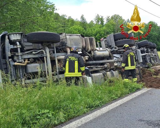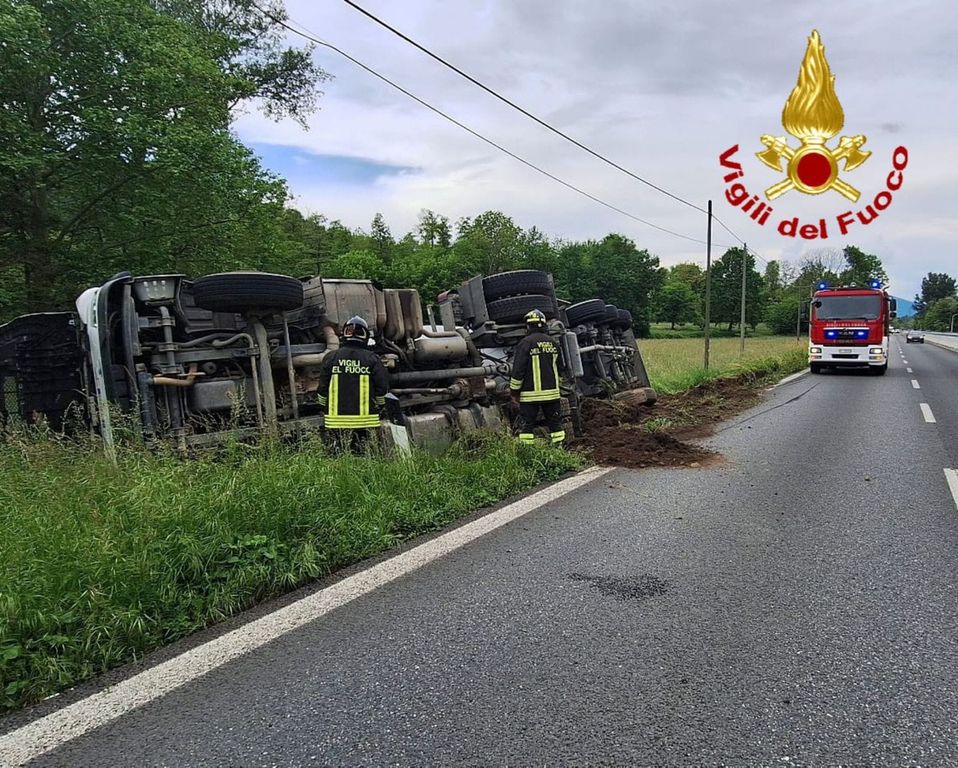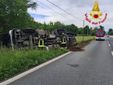 FOTO. Comabbio, autoarticolato si ribalta sulla Vergiate-Besozzo: ferito lievemente il conducente