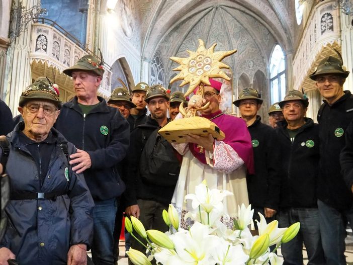 Accompagnata da una delegazione di penne nere olgiatesi, infatti, la Stella che contiene le reliquie dei principali santi e beati legati al mondo alpino è stata esposta, insieme al Labaro Nazionale degli Alpini, sull’altare durante la Santa Messa Solenne celebrata dal vescovo di Biella, monsignor Roberto Farinella.