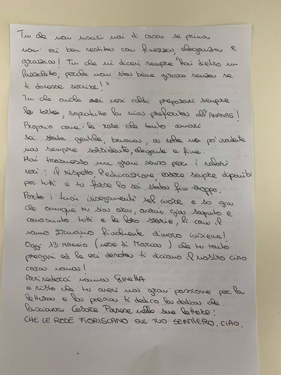Appassionata di lettura, le piaceva molto scrivere ma anche rifugiarsi in estate in Valsesia. «Il suo nome racchiude un profondo significato – scrive Erica nella missiva indirizzata alla nonna che vi riportiamo integralmente nella galleria fotografica – che calza proprio a pennello: amore verso il prossimo, gentilezza immensa verso tutti, servizio e umiltà. Porto i tuoi insegnamenti nel cuore e so che ovunque tu sia ora, avrai già conosciuto tutti, lì con il nonno Ermanno, finalmente di nuovo insieme».