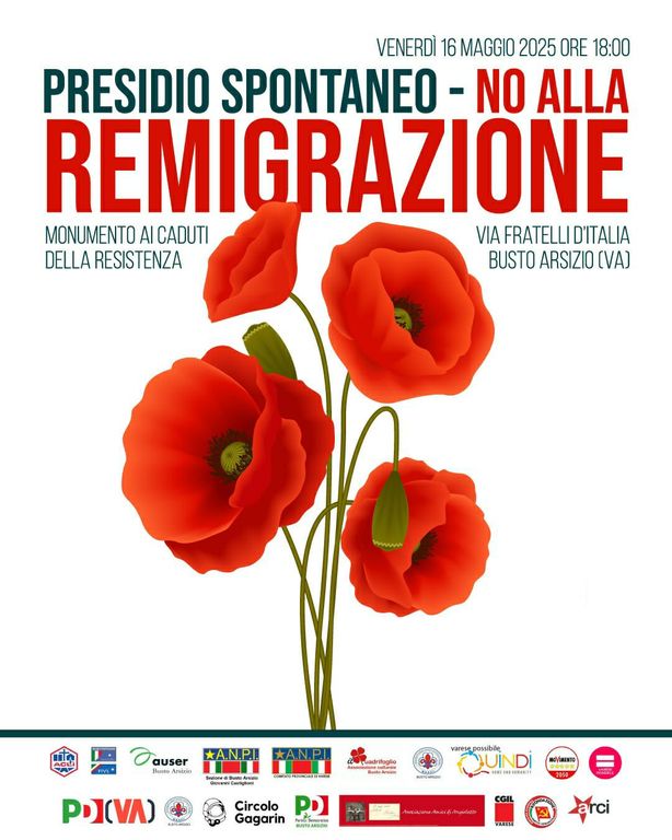Anpi Provinciale Varese e Anpi Busto Arsizio promuovono un presidio spontaneo per stasera alle ore 18 in via Fratelli d’Italia, davanti al monumento ai Caduti della Resistenza (locandina completa in fondo). Comunicano che «il presidio è finalizzato a ribadire il rifiuto di teorie ediniziative delle ali più estreme delle destre europee e in particolare della teoria della cosiddetta “remigration”, carica di significati razzisti. Sarà un presidio spontaneo e pacifico contro il razzismo e a difesa dei diritti umani».