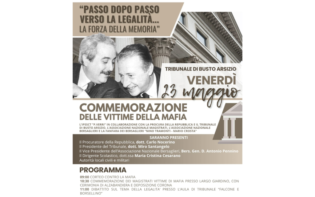 Con bersaglieri, giudici e scuole, il 23 maggio il tribunale di Busto Arsizio vuole ricordare i magistrati vittime della mafia e offrire una importante lezione di vita agli studenti affinché credano e vivano nella legalità. All’evento parteciperanno il Procuratore della Repubblica Carlo Nocerino, il Presidente del Tribunale di Busto Arsizio Miro Santangelo, il Vice Presidente Nazionale della Associazione Bersaglieri Antonio Pennino e la Dirigente scolastica Maria Cristina Cesarano con gli studenti dell’Istituto Professionale “Pietro Verri”.