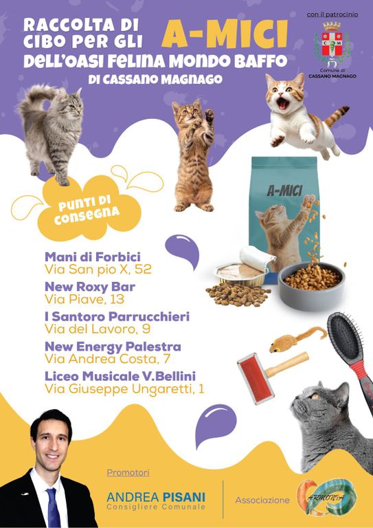 Andrea Pisani Consigliere Comunale: «Ho deciso di promuovere, insieme all’Associazione Armonia, questa raccolta di cibo per i simpatici ospiti dell’oasi felina Mondo Baffo per aiutare fattivamente i volontari che con abnegazione si occupano dei gatti meno fortunati oramai da 15 anni. Ho riscontrato questo desiderio anche nei titolari di alcune attività, che dovendo lavorare non riescono a recarsi fisicamente nella struttura, e ho fatto da collettore con l’obiettivo di coinvolgere il maggior numero di Cassanesi per creare un network efficace sul Territorio che contribuirà a rafforzare la coesione sociale attraverso l’aiuto reciproco per uno scopo altruistico a favore degli animali. Iniziative come questa testimoniano la grande attenzione che storicamente la città ha sempre avuto verso il Terzo Settore, sarà un ulteriore esempio per stimolare ciascuno ad impegnarsi, anche per poche ore alla settimana, nelle attività di volontariato».