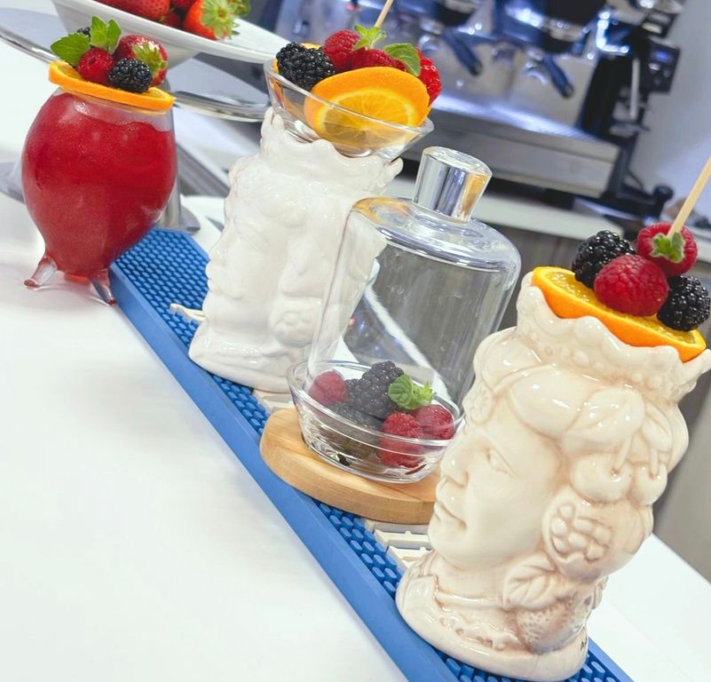 Ecco Virgilio, razionalità e guida. Si fa verde acceso: equilibrio, saggezza, mente lucida. Beatrice, invece, è celestiale: un cocktail azzurro, trasparente, che scivola etereo come la sua grazia divina. Poi Caronte. Potente, cupo, inevitabile. Ghiaccio, profondità, mistero: un drink che traghetta i sensi, non solo le anime. Paolo e Francesca? Una coppia inseparabile anche nei bicchieri. Teste di moro in ceramica, dolcezza amara, passione che sfida la morte. E Ulisse? Fiamma e follia. Zucchero in fiamme, ardente come la sua sete di conoscenza che diventa condanna eterna.