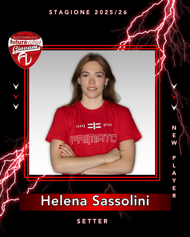 Terzo volto nuovo della Futura Volley 2025/26 è quello di Helena Sassolini. Con lei, le nuove arrivate sono Gaia Moroni (opposta) e Alice Farina (centrale). Due (e non ce ne saranno altre) le conferme rispetto all'anno scorso: capitan Sofia Rebora (centrale) e Bianca Orlandi (schiacciatrice).