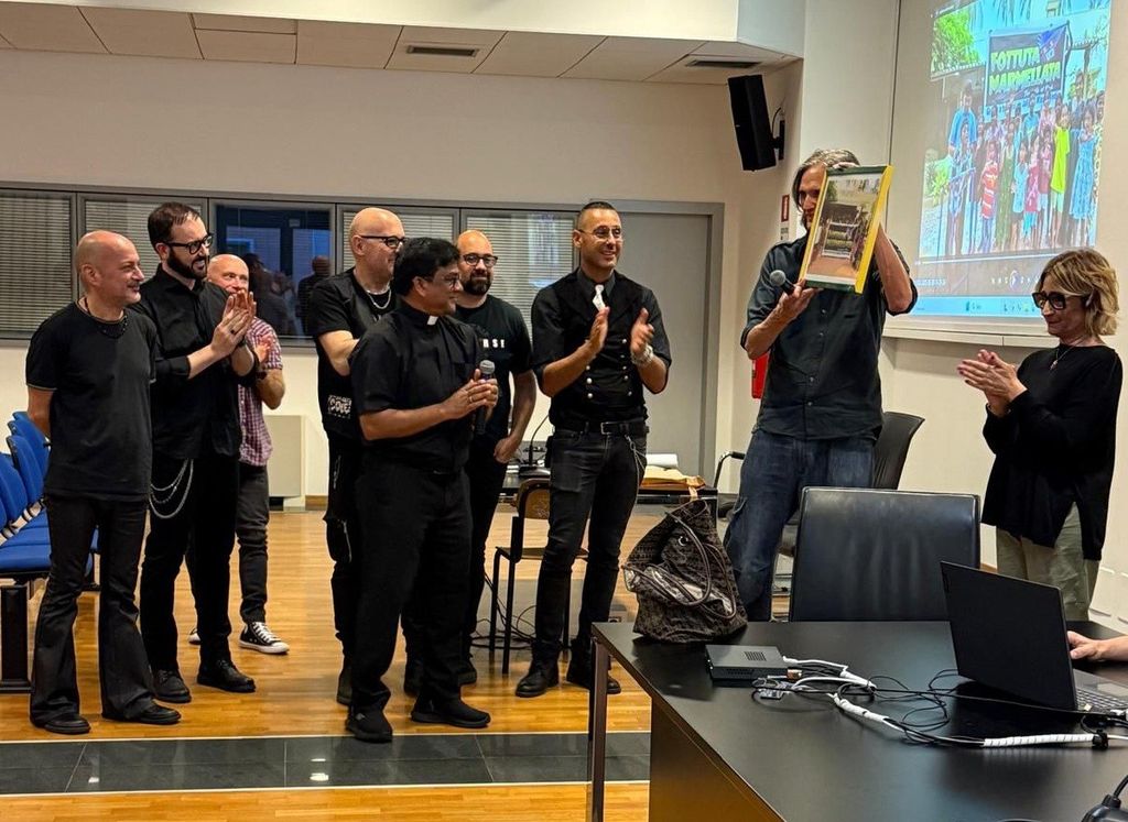 Accanto a lui, Barbara Baronti ha raccontato con parole semplici ma toccanti il suo viaggio in India: dalla consegna della carrozzina alla visita nella colonia dei lebbrosi, esperienza che ha lasciato un segno profondo in lei. Il momento più emozionante della serata è arrivato poco dopo, quando un videomessaggio dei bambini della missione, accompagnato da una foto con uno striscione dedicato ai Fottuta Marmellata, è stato proiettato in sala. Un gesto che ha colpito nel profondo la band, che ha ringraziato visibilmente commossa.