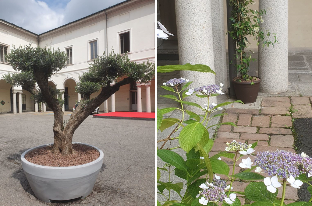 Il cortile di Palazzo Gilardoni diventa più verde. Da qualche giorno, al centro del parcheggio del municipio è “spuntato” un ulivo, mentre tra le colonne del porticato sono stati posizionati ortensie e gelsomini.