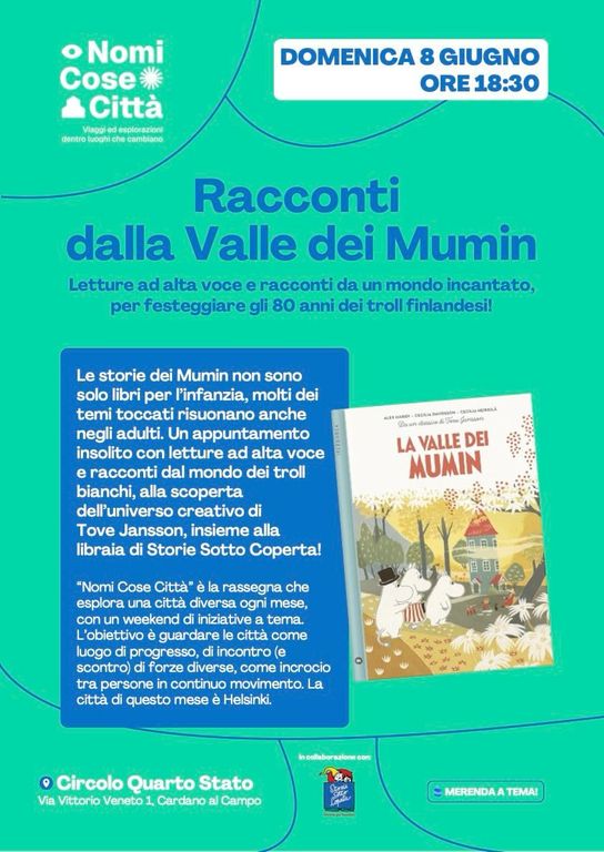 L'incontro, intitolato “Racconti dalla Valle dei Mumin”, è pensato per bambini e adulti insieme: un momento di letture ad alta voce e narrazione partecipata, a cura della libraia di “Storie Sotto Coperta”, per celebrare gli 80 anni di questi personaggi che, nati come figure del mondo dell’infanzia, sono diventati simboli universali di empatia, libertà e non conformismo.