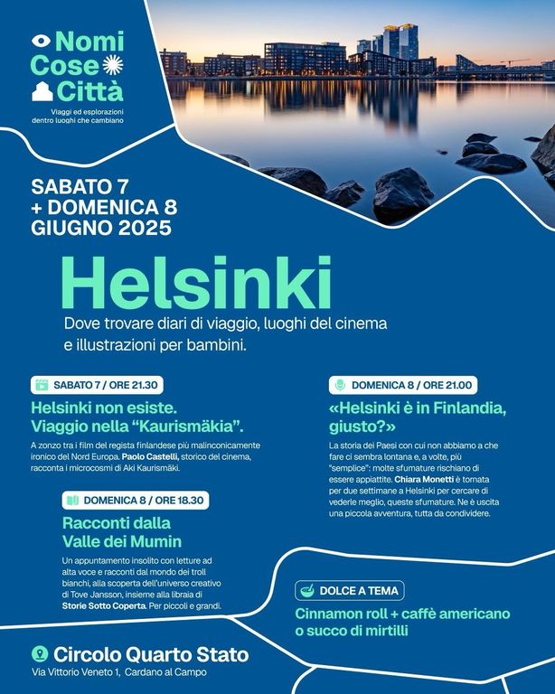 "Helsinki non esiste. O forse sì. Basta guardarla attraverso gli occhi giusti.” È con questa provocazione che sabato 7 e domenica 8 giugno il Circolo Quarto Stato di Cardano al Campo trasforma la sua sede in una porta aperta sul Nord Europa, dedicando la nuova tappa della rassegna “Nomi, cose, città” alla capitale della Finlandia.