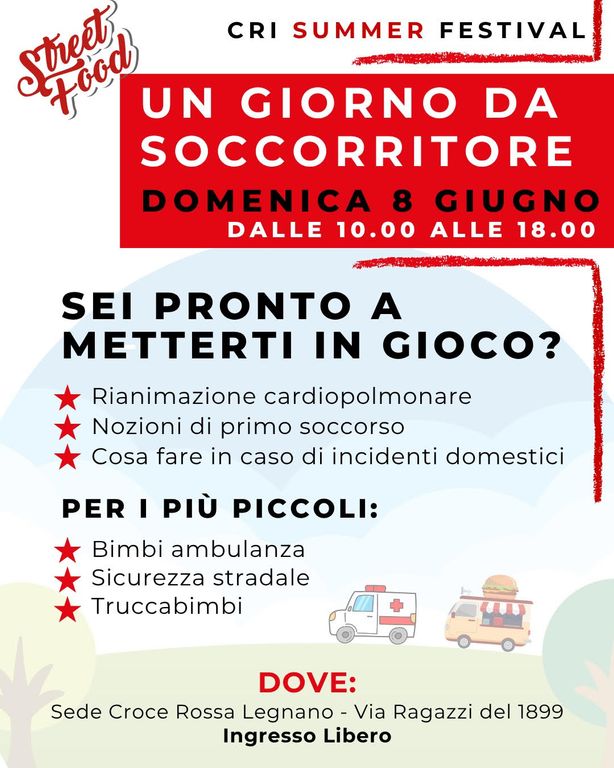 Domenica 8 giugno nella sede di via Ragazzi del 1899 a Legnano, i diversi gruppi di lavoro del Comitato organizzeranno stand tematici aperti alla cittadinanza, offrendo informazioni e dimostrazioni pratiche su temi di grande utilità, tra cui il primo soccorso, la rianimazione cardiopolmonare (RCP), la gestione delle piccole emergenze quotidiane e dei traumi domestici, e molto altro ancora.