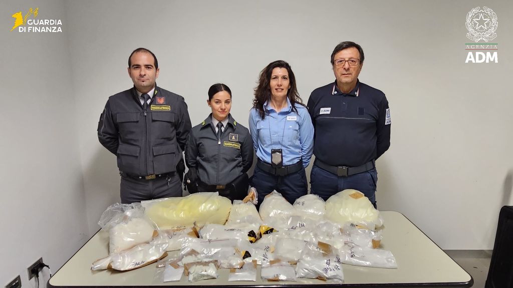 Nell'ambito di due interventi distinti svolti congiuntamente da Agenzia delle Dogane e Guardia di Finanza, sono state fermate due persone, una proveniente dal Messico l'altra dalla Guinea. La prima è stata sorpresa con 1,1 kg della sostanza stupefacente occultata all'interno di bombolette spray, crema per il corpo e salviette umidificate. La seconda con 1,5 kg di cocaina in 68 ovuli ingeriti prima della partenza