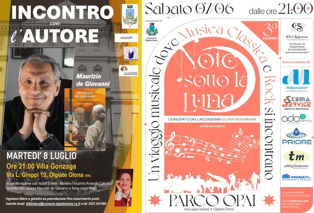 Due serate tra emozioni e cultura a Olgiate Olona, dove tornano protagonisti appuntamenti molto attesi. Da una parte, l'inconfondibile penna noir di Maurizio de Giovanni; dall’altra, il suggestivo mix di musica classica e rock sotto le stelle con “Note sotto la Luna”.
