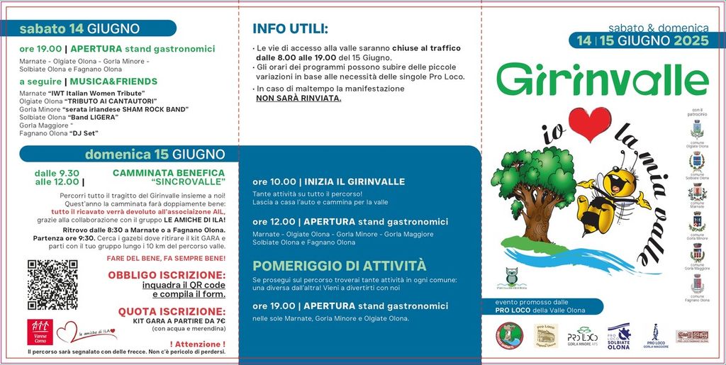 Manca poco ormai al Girinvalle. L’appuntamento con il tradizionale evento dedicato alla valle e che si sviluppa lungo le sponde del fiume Olona è per sabato 14 giugno e per domenica 15. Punti ristoro, passeggiate, giochi per i bambini e musica immersi nella natura sono alcuni degli ingredienti della manifestazione promossa dalle sei Pro Loco dei paesi coinvolti: Olgiate Olona, Fagnano Olona, Solbiate Olona, Gorla Minore, Gorla Maggiore e Marnate.