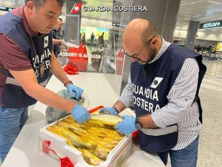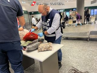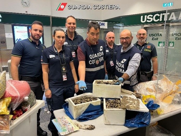 Raffica di controlli di Guardia Costiera, Adm e Guardia di Finanza martedì scorso in aeroporto sui bagagli dei passeggeri provenienti dai voli dall'Oriente: sequestrati 650 chili di prodotti ittici e di circa 170 chili di vegetali nascosti nelle valigie potenzialmente dannose ed invasive. In totale sono state 40 le ispezioni e 17 i verbali di distruzione emessi