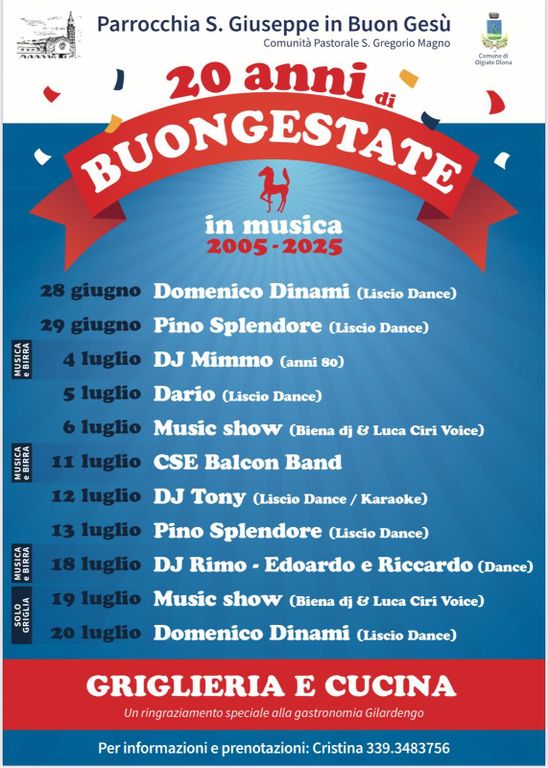 Quest’anno la musica e il buon cibo del Buongestate attendono tutti a partire da sabato 28 giugno, e la festa proseguirà ogni venerdì, sabato e domenica sera, sino al 20 luglio.