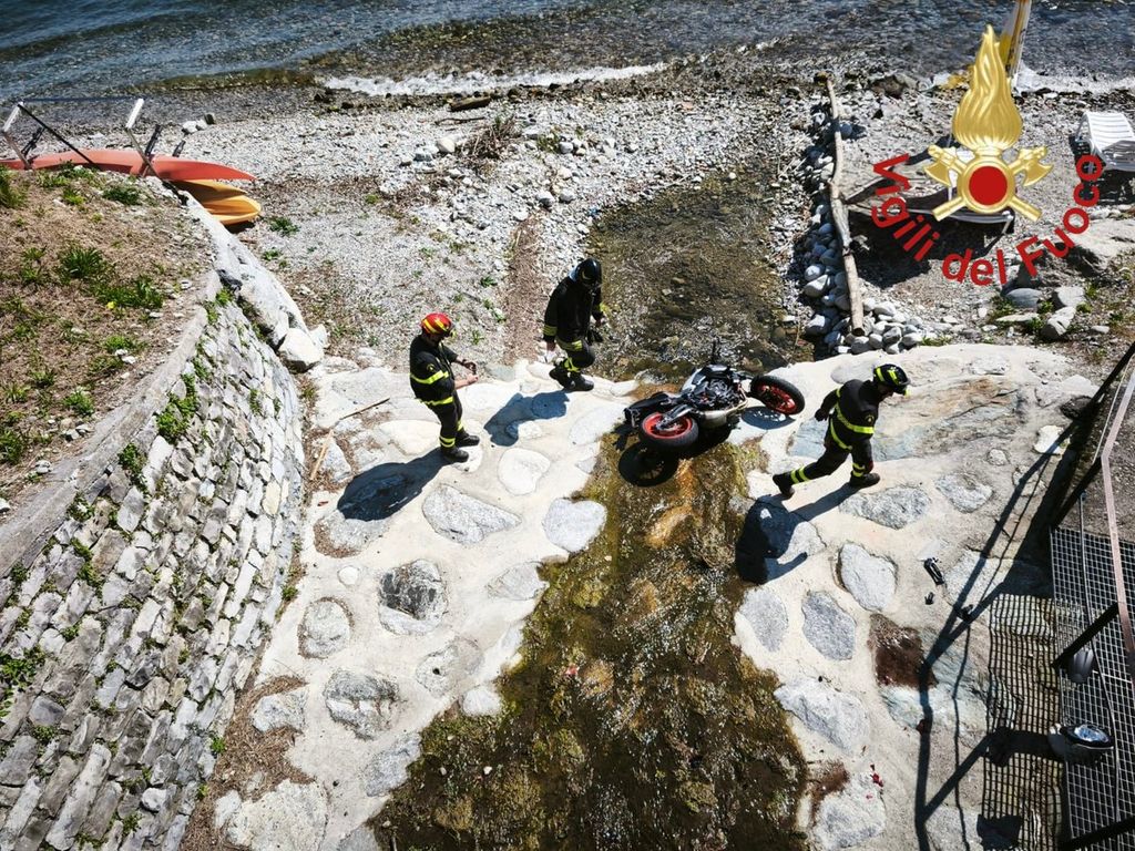 Un motociclista cinquantasettenne miracolosamente quasi illeso: la sua moto sbatta sulla ringhiera e precipita dalla statale del lago di Como, lui se la cava
