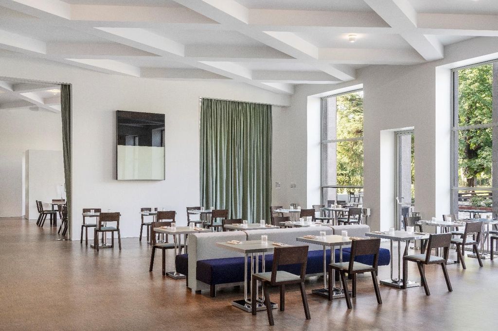 Ristorante e caffetteria (aperti dalle ore 10,30 alle ore 23,00) riprendono posto nella location dove li aveva pensati Giovanni Muzio con la collaborazione progettuale e degli arredi fissi di AR.CH.IT Luca Cipelletti, direttore architettonico del Palazzo dell’Arte dal 2019. La prospettiva sui “Bagni misteriosi”, la fontana di Giorgio De Chirico guida i visitatore nel contesto museale e lo rende ancora più unico ed originale. “Le sei nicchie in boiserie del progetto originale di Muzio – ricorda Luca Cipelletti - sono state reinterpretate in chiave contemporanea e funzionale. Per le pareti degli arredi fissi sono stati utilizzati dei pannelli di rovere bacchettato che ne alleggeriscono la percezione, fanno vibrare la luce e hanno anche funzione acustica. Il telaio strutturale è in evidenza, il metallo bianco a contrasto riprende esattamente il disegno dei grandi serramenti tripartiti sul lato opposto verso il giardino. Il dialogo è ulteriormente enfatizzato da specchiature che portano il verde del parco e la fontana di de Chirico all’interno degli spazi.”