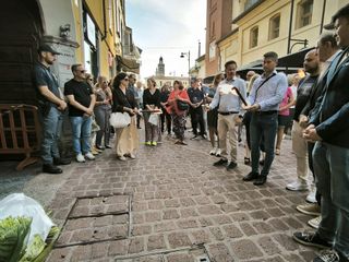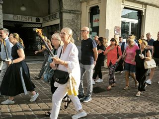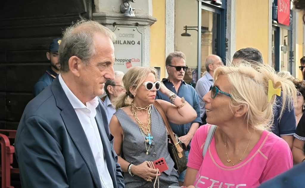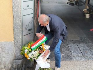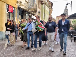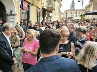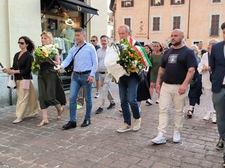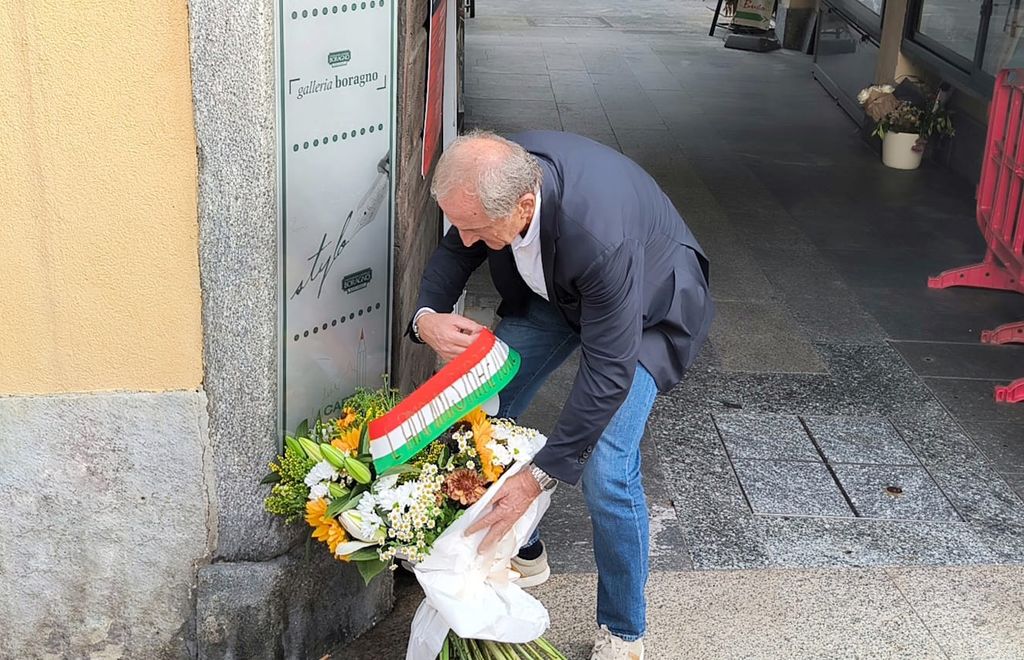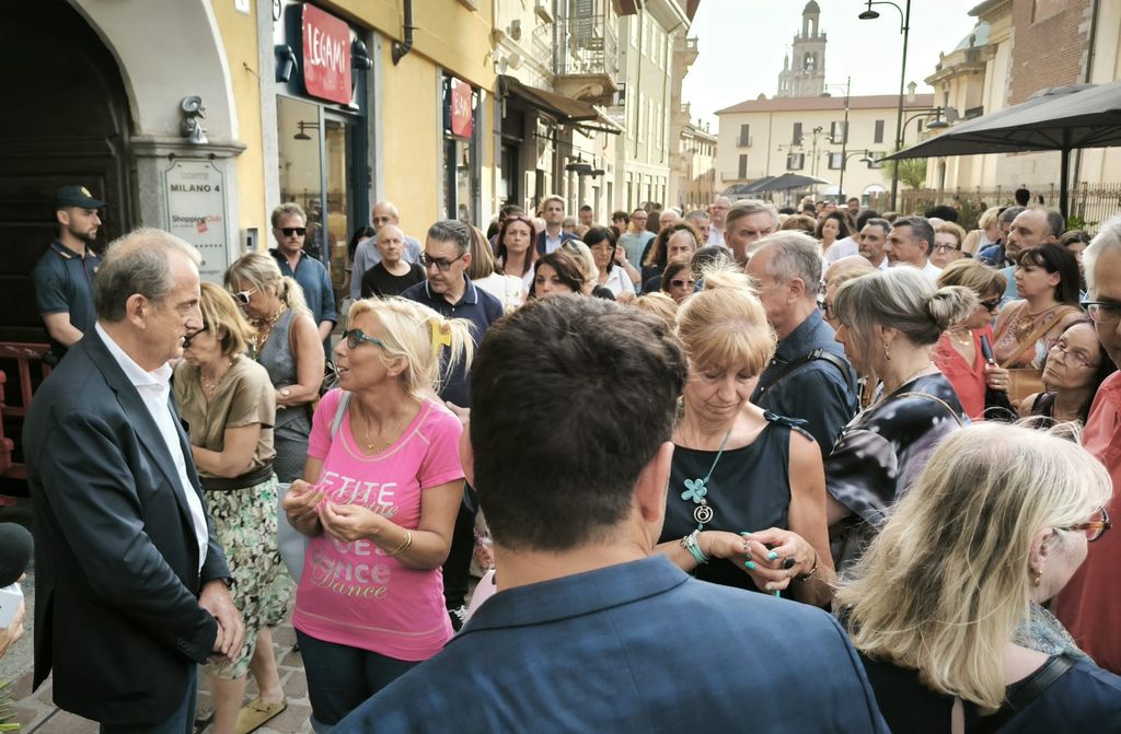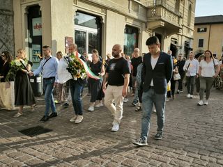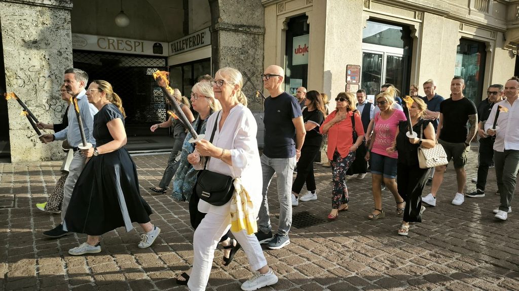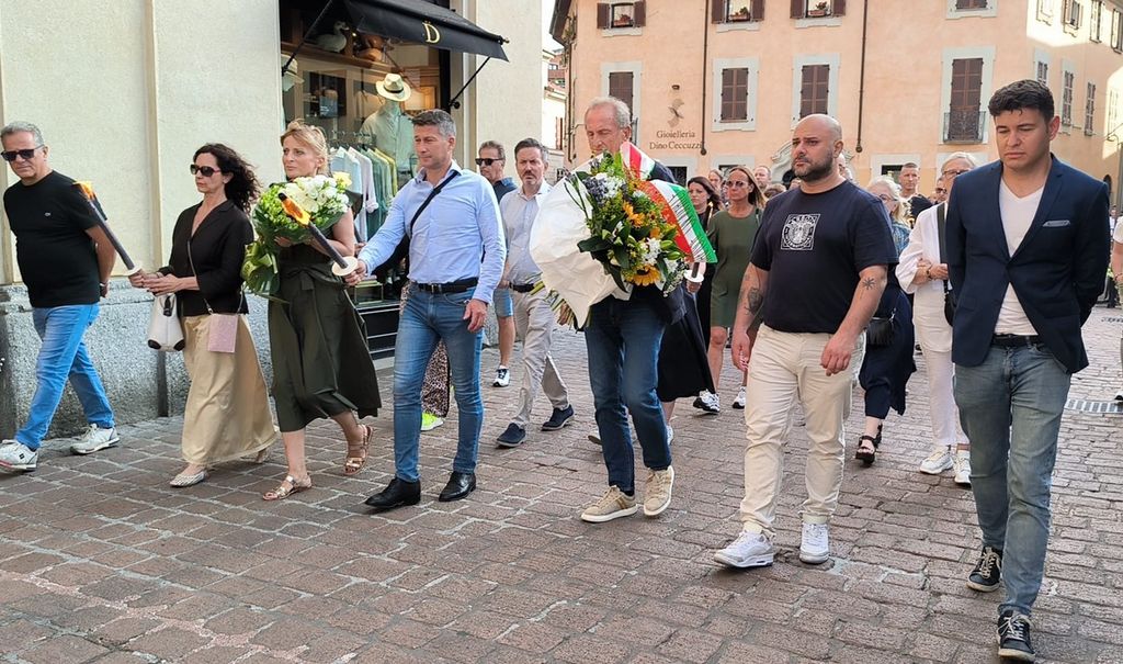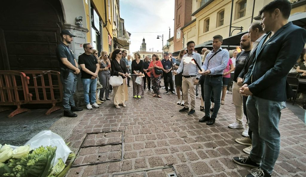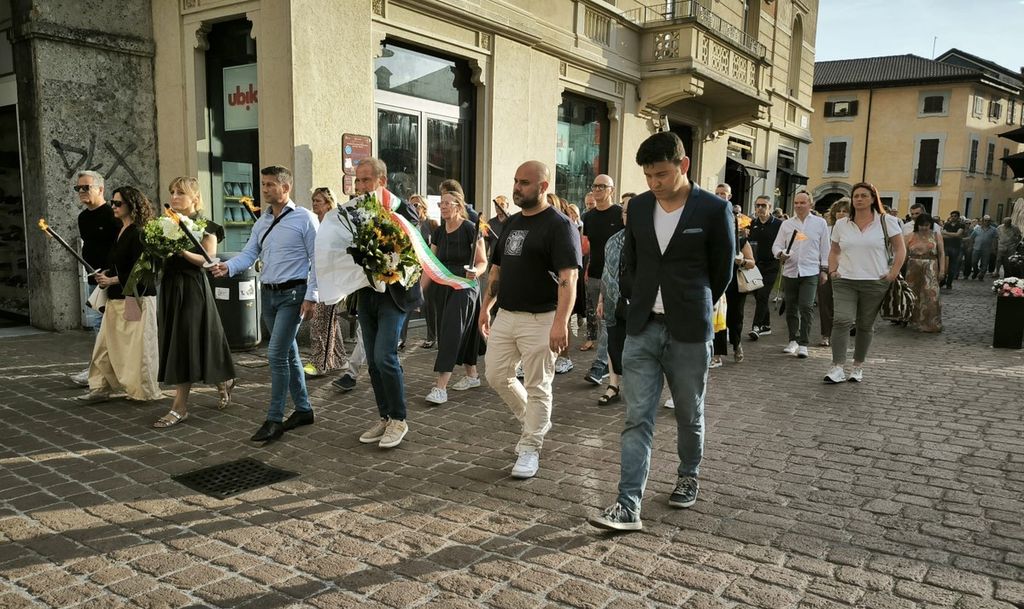 FOTO e VIDEO. A 24 ore dal delitto, la comunità ha risposto con una manifestazione silenziosa guidata dal sindaco e dalle associazioni. Fiori e applausi davanti al negozio di via Milano, simbolo del lutto cittadino