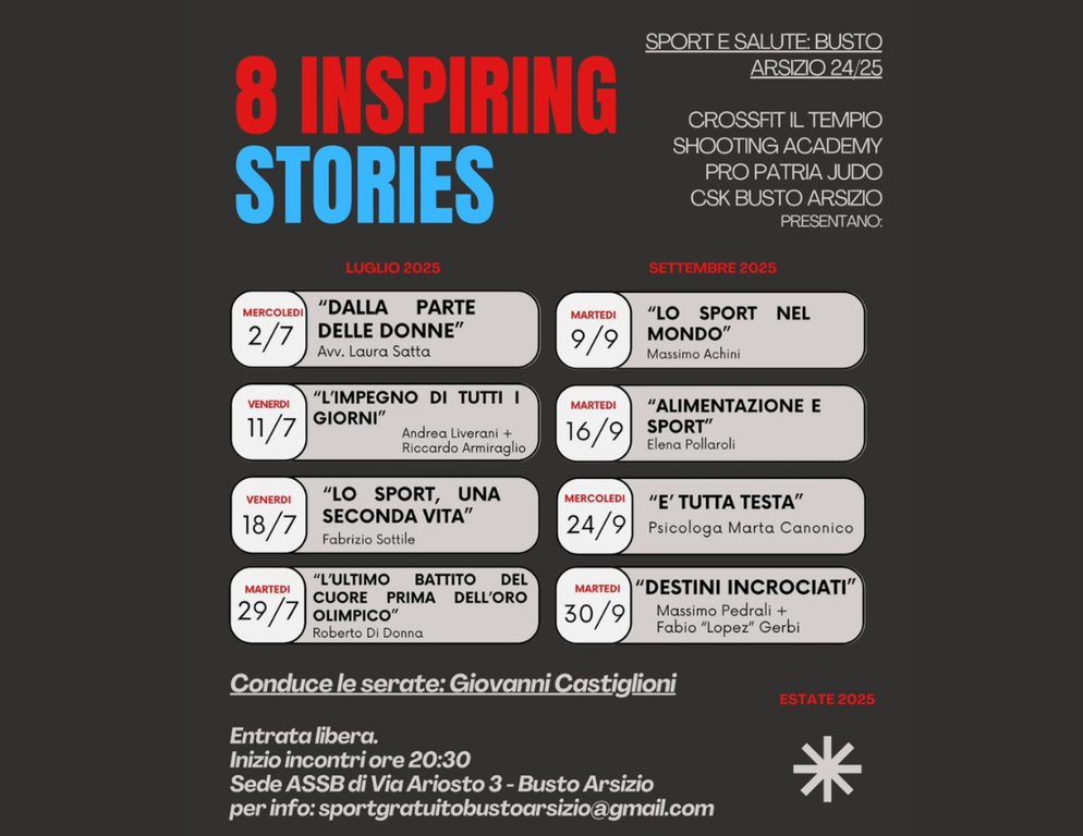 Otto serate per raccontare otto storie di vita, dove lo sport diventa il filo conduttore per affrontare temi universali: dalla violenza di genere alla psicologia, dalla nutrizione all'impegno sociale. Nasce «8 Inspiring Stories», un ciclo di incontri gratuiti e aperti a tutta la cittadinanza, presentati da CrossFit il Tempio, Shooting Academy, Pro Patria Judo e CSK Busto Arsizio, che si terranno tra luglio e settembre 2025 alla sede ASSB di Via Ariosto 3.