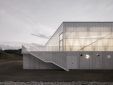 Il sistema di travi metalliche scorrevoli definisce uno spazio protetto e di transizione verso il bar al primo piano, accessibile tramite una rampa esterna, mentre la terrazza offre una vista sul bosco di betulle che separa l'edificio dal parcheggio. I due livelli intessono un rapporto simbolico con la terra e con il cielo, tradotti in una base in calcestruzzo grezzo e un volume superiore in vetro e policarbonato. Quest'ultimo, riflettendo i colori del cielo, varia al variare della luce, mentre il contrasto materico e formale genera una tensione visiva che dà risalto alla semplicità delle geometrie.
